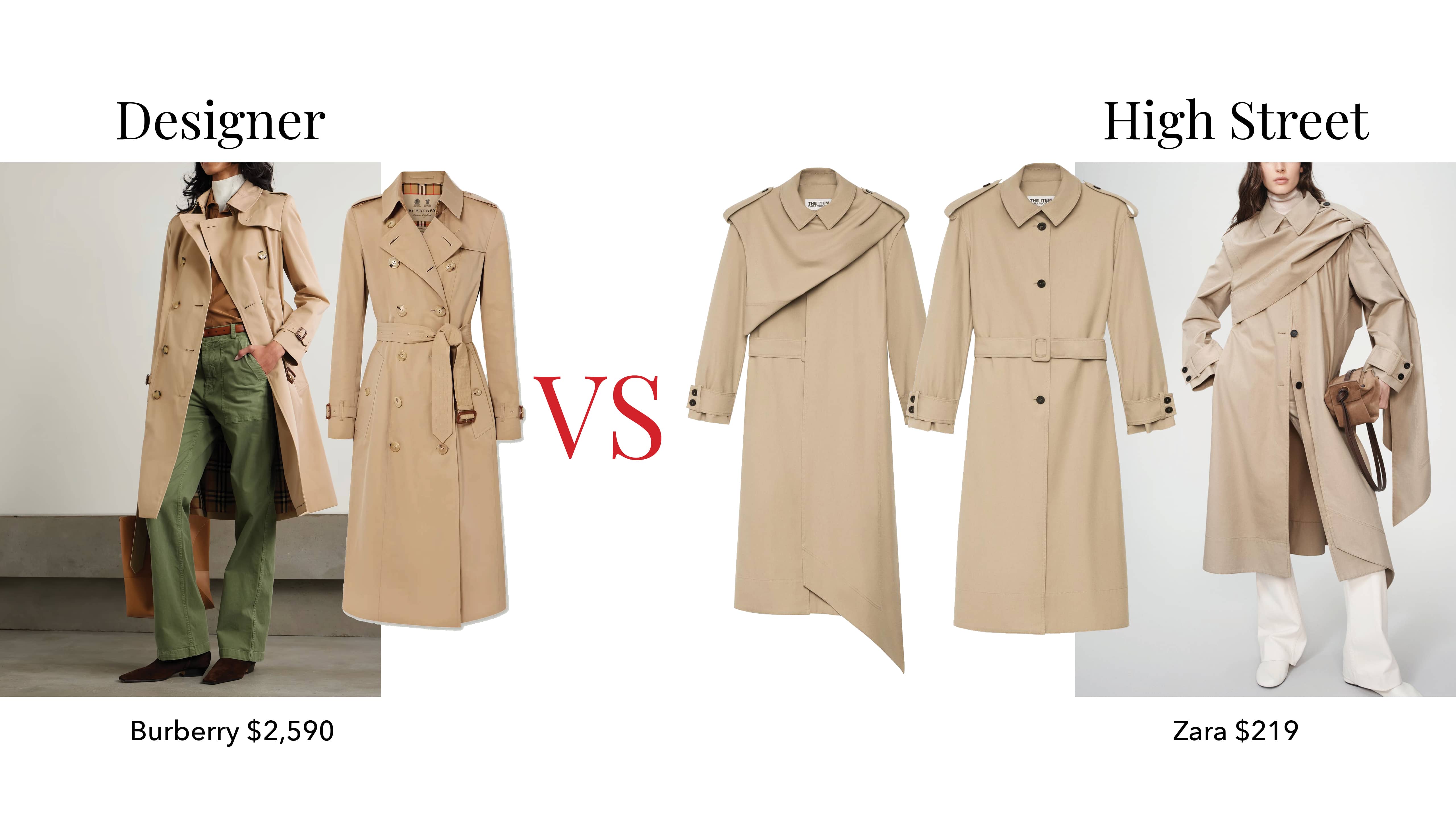 On the right side, you'll see a trench from Zara at a much lower price point, $219, that has strong structure, interesting design details, maybe a removable layer or an asymmetrical element. The key is not the label. The key is the silhouette.